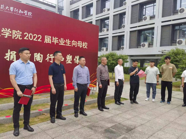 捐赠仪式上,刘星喜发表讲话。他代表学院向2022届毕业生表示感谢,对毕业生感恩母校、回报母校的实际行动表示肯定。刘星喜引用陶行知先生的名句:“千教万教教人求真,千学万学学做真人”,阐释了行知学院与陶行知先生的不解之缘。“陶行知先生是一位杰出的教育家和爱国主义者,他‘以学生为中心’的教育思想也一直是行知学院秉持的办学理念!”陶行知先生的塑像正式“落户”行知学院,既是我们行知人对陶行知先生的敬仰和纪念,也是行知人对教育事业的郑重承诺。行知学院师生将永远铭记这位伟大的教育家,传承和发扬陶行知的爱国主义精神和教育理念。