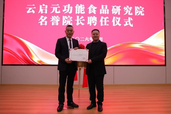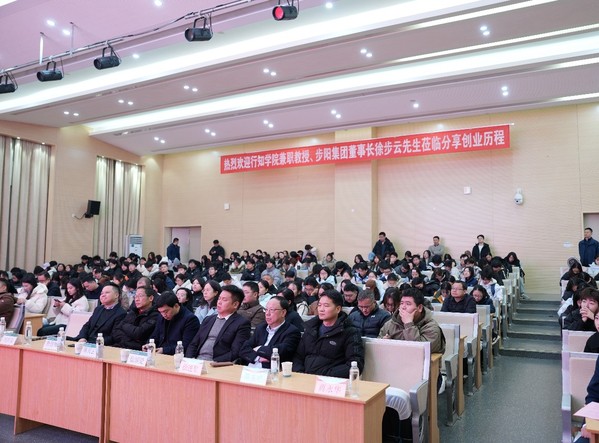 随后,活动进入第二阶段。在步云楼报告厅,学院举行“云启元功能食品研究院”揭牌仪式,徐步云董事长受聘为研究院名誉院长。徐步云还围绕《与时代同频 与奋斗共舞——步阳集团的创业之路》主题,与在场师生分享创业经验,并进行互动交流。